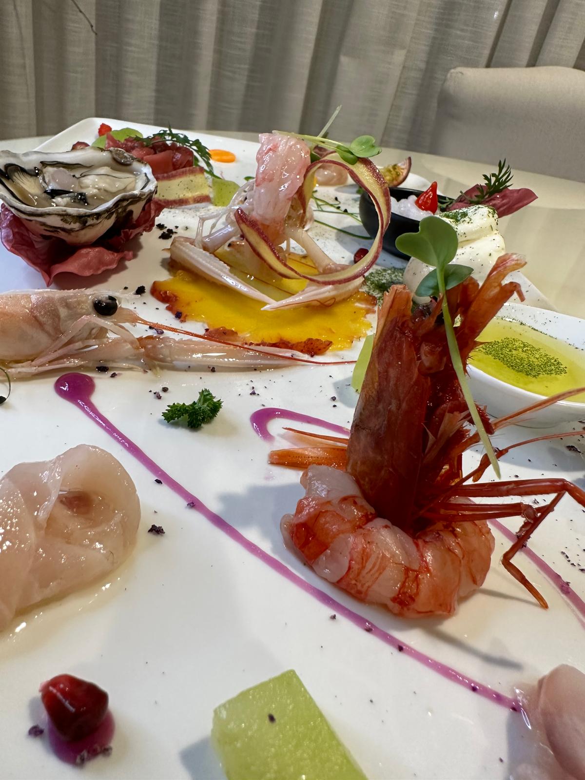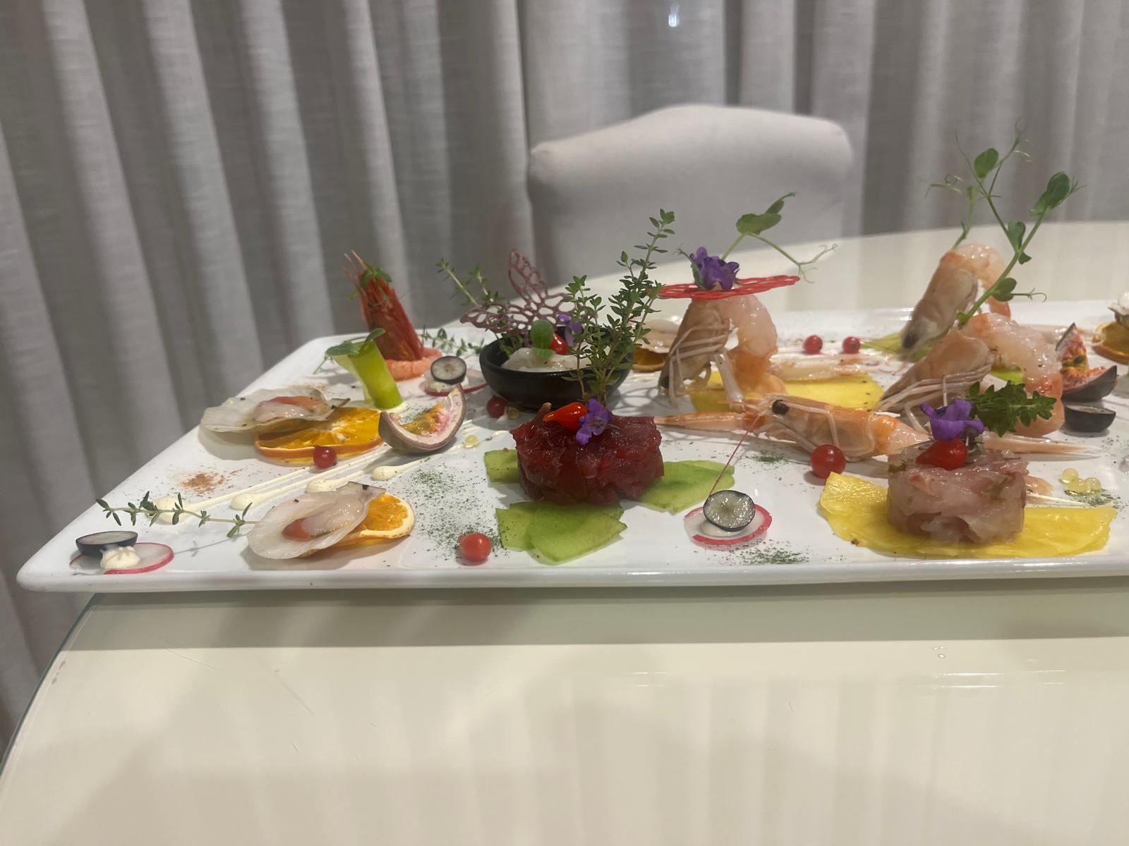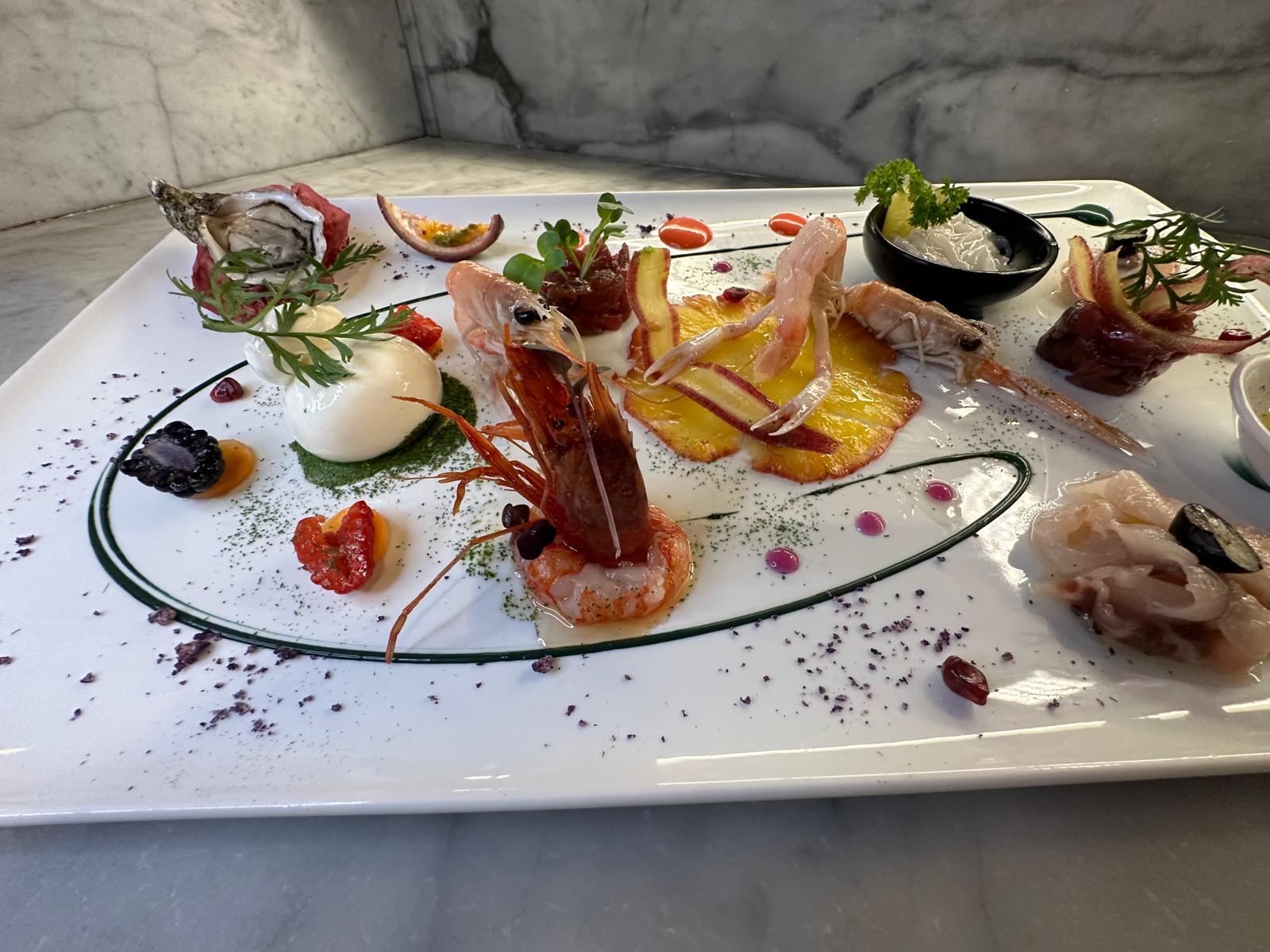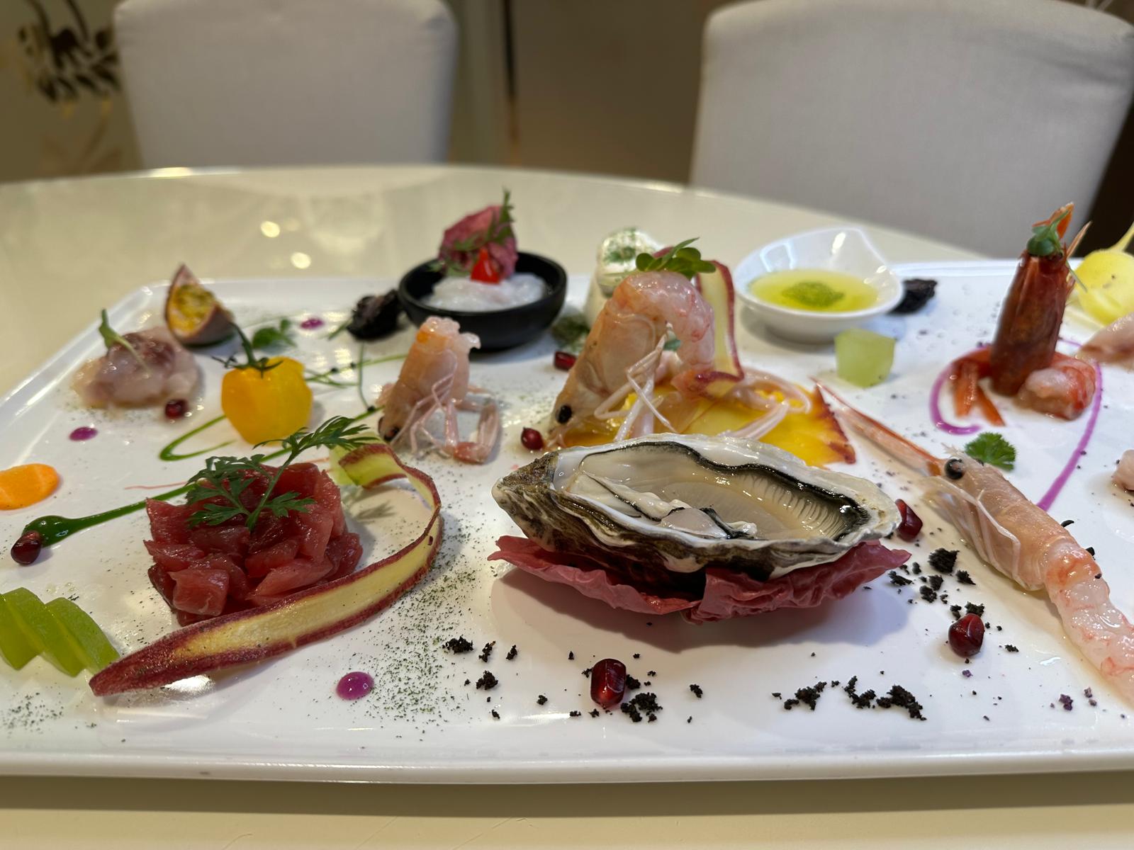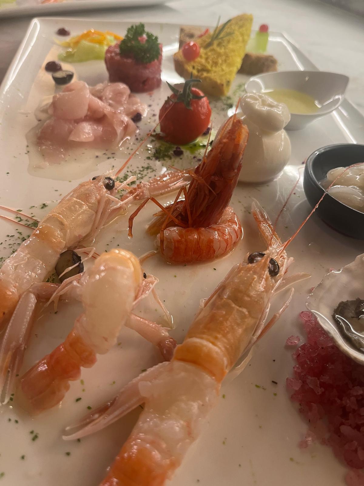 (Insalata di mare, Cernia cotta a bassa temperatura con julienne di Verdurine, Dentice mantecato, Salmone cotto al vapore ,code di Gambero, Mazzancolla e Scampo bolliti , carpaccio di Tonno su letto di Rucola, Capasanta alla piastra, Baccalà mantecato)