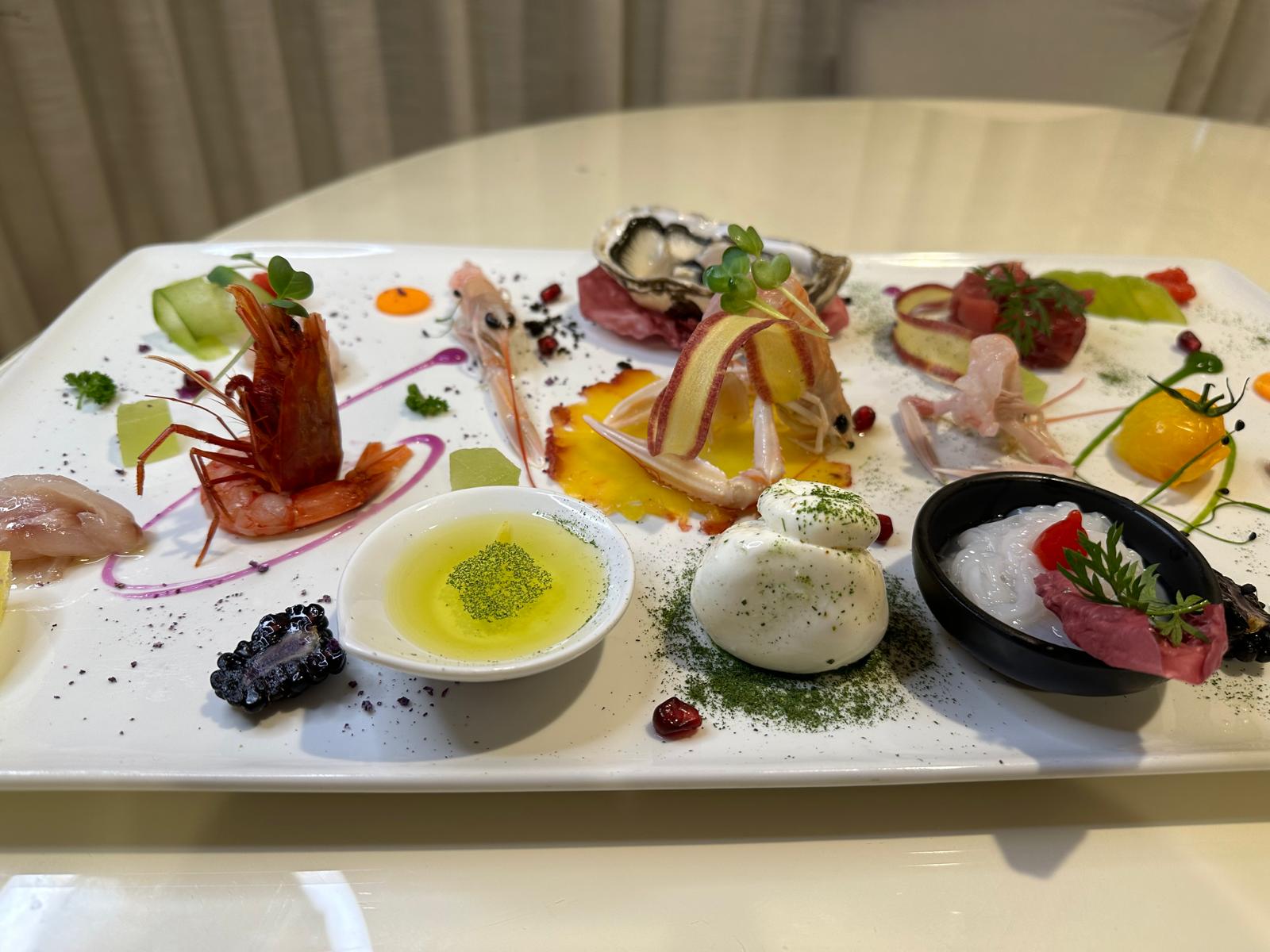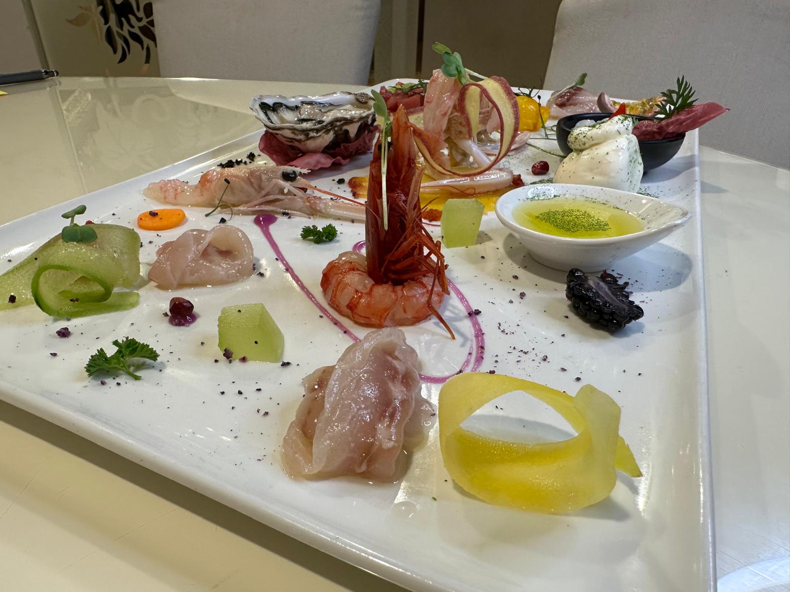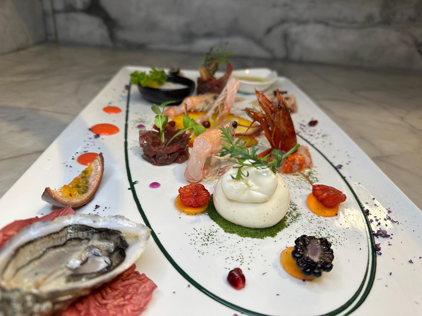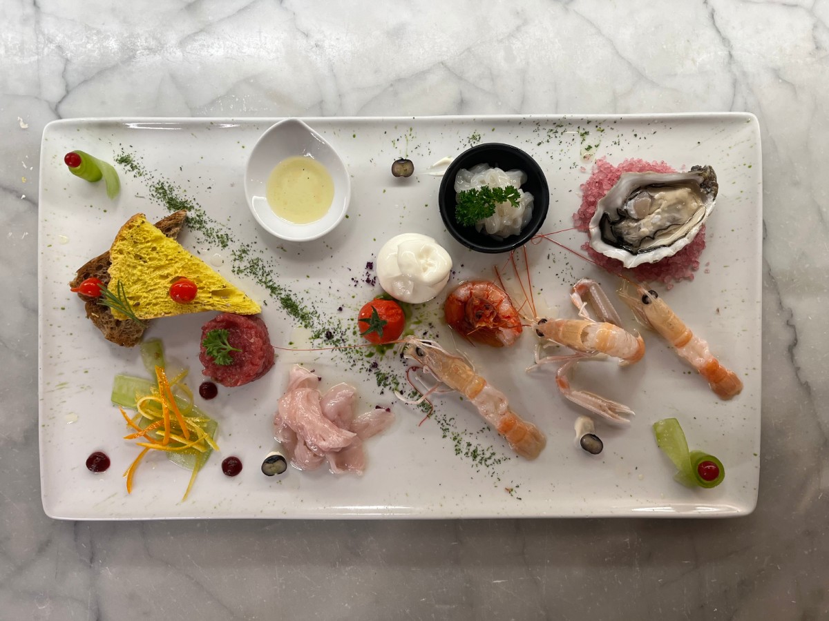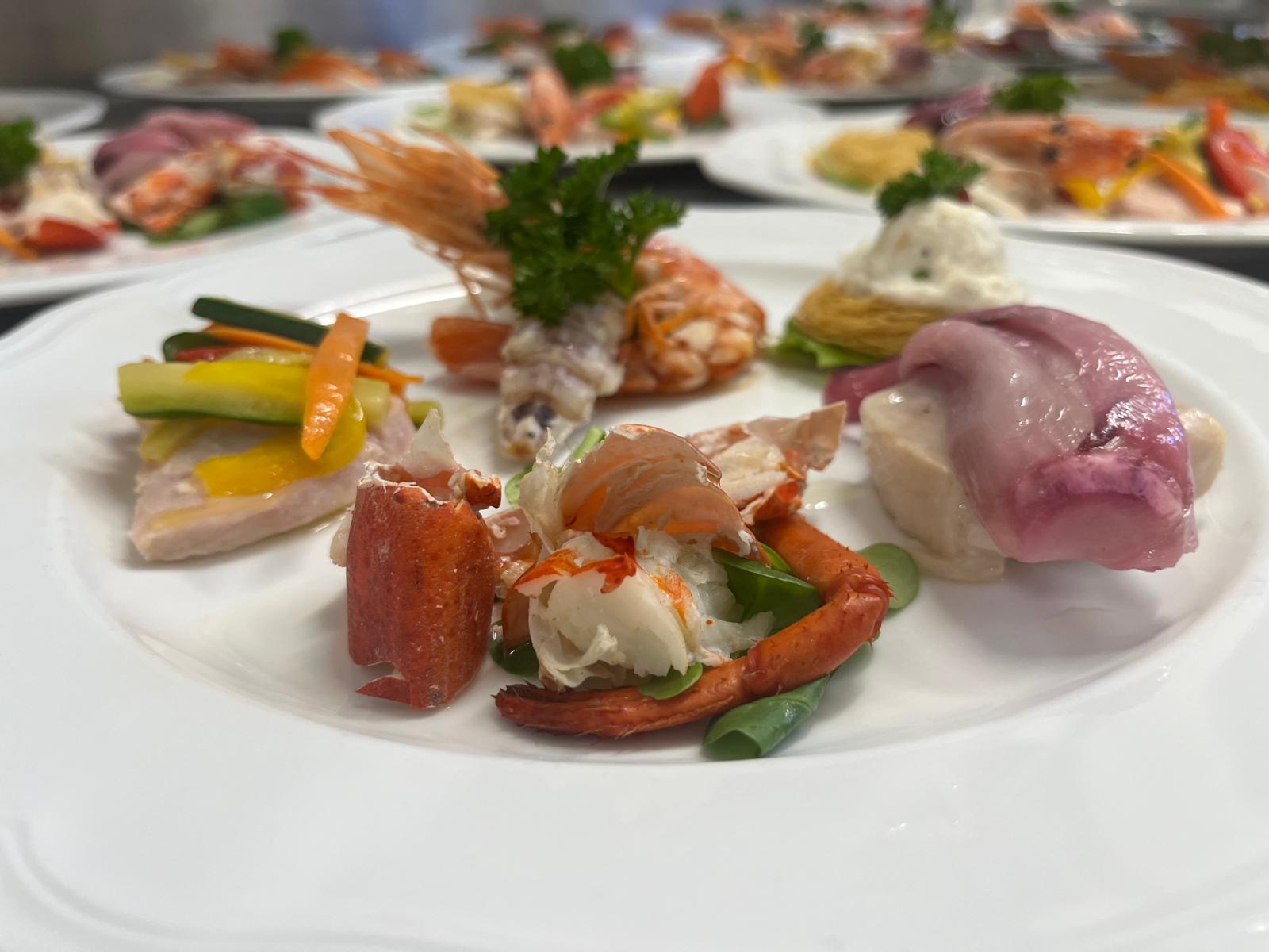 (Insalata di mare, Cernia cotta a bassa temperatura con julienne di Verdurine, Dentice mantecato, Salmone cotto al vapore ,code di Gambero, Mazzancolla e Scampo bolliti , carpaccio di Tonno su letto di Rucola, Capasanta alla piastra, Baccalà mantecato)