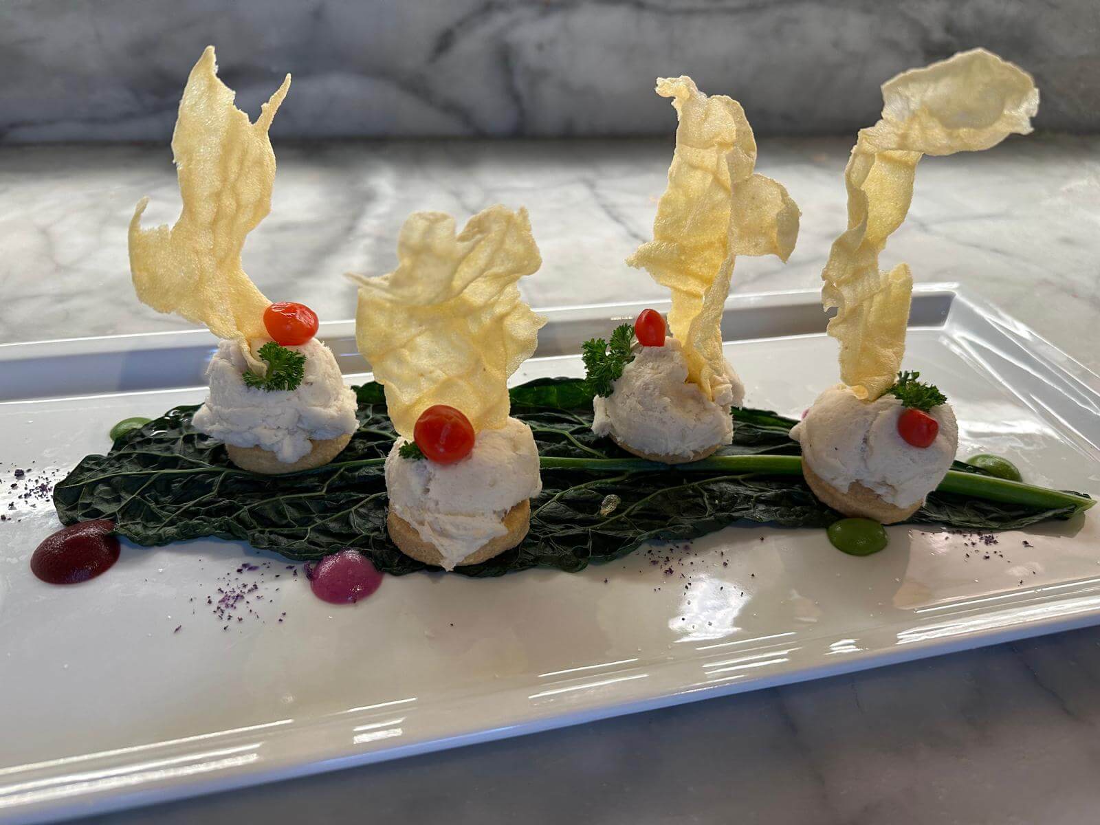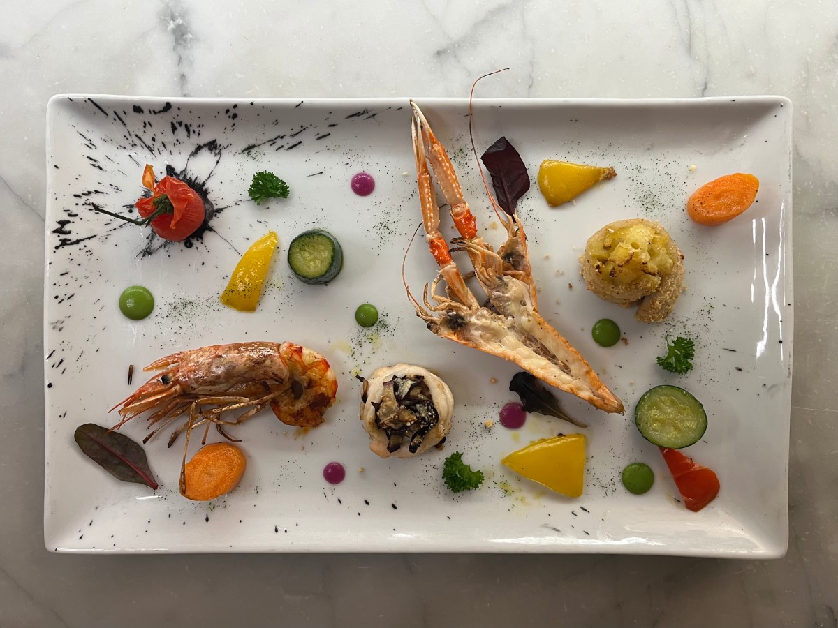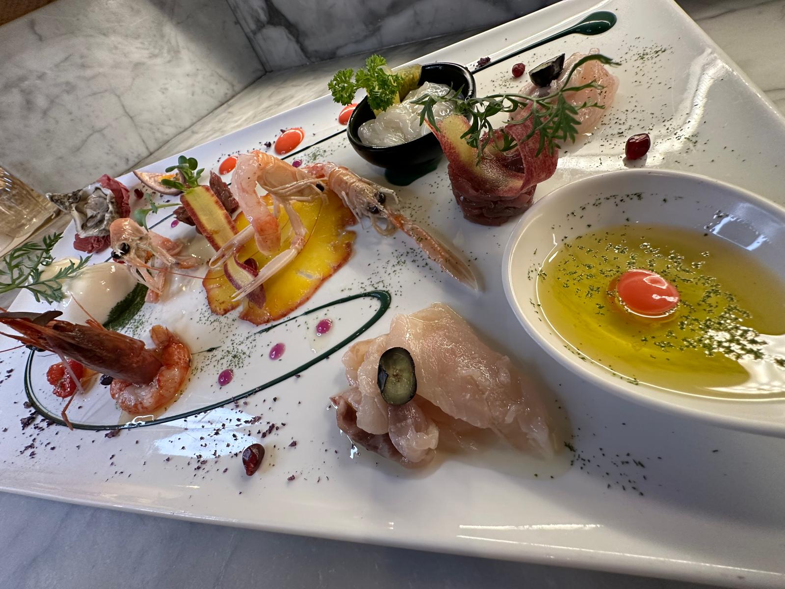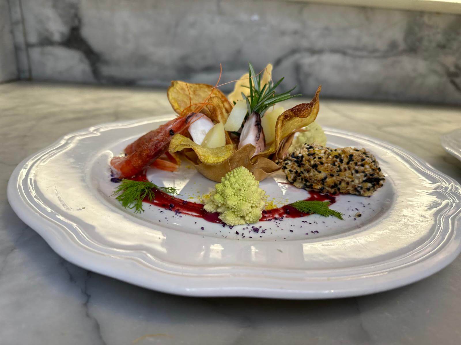 Baccalà mantecato, Scampo in volo, Tataki di Tonno in crosta di Sesamo, Calamaro Cacciarolo Arricciato e Carpaccio di Pesce Spada Marinato