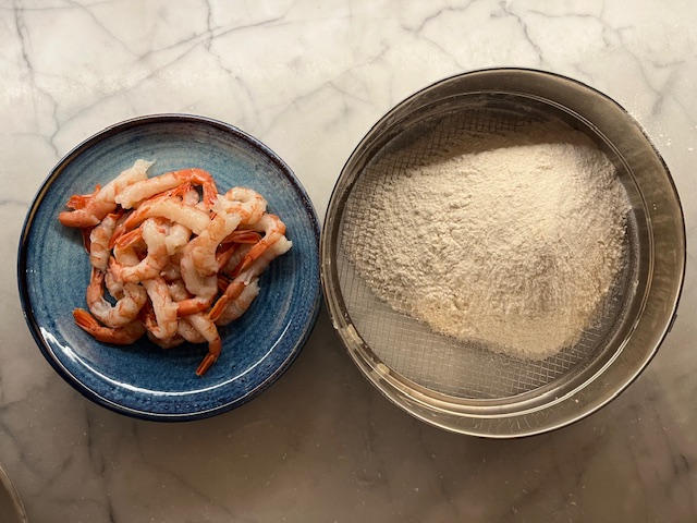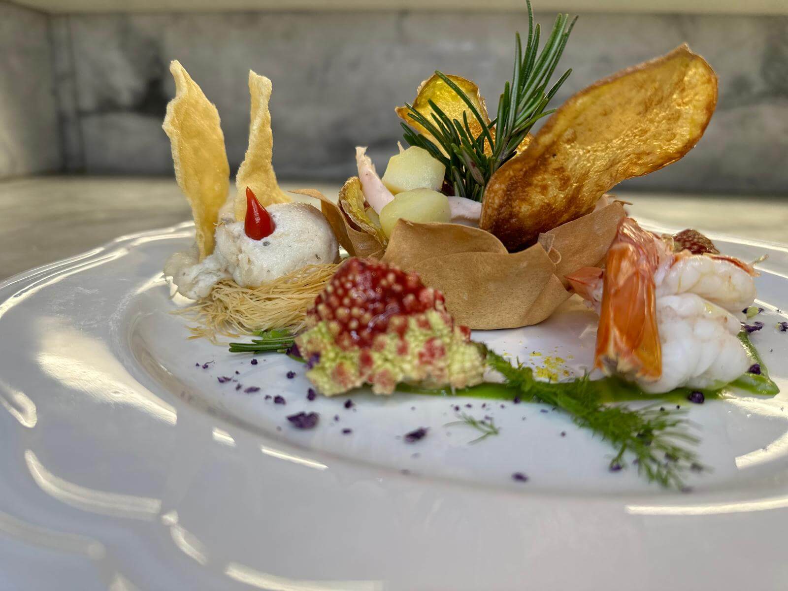 Gambero con abbraccio di pasta Kataifi su letto di salsa Tartara accompagnato da Metodo Classico “Cuveè Voyage”