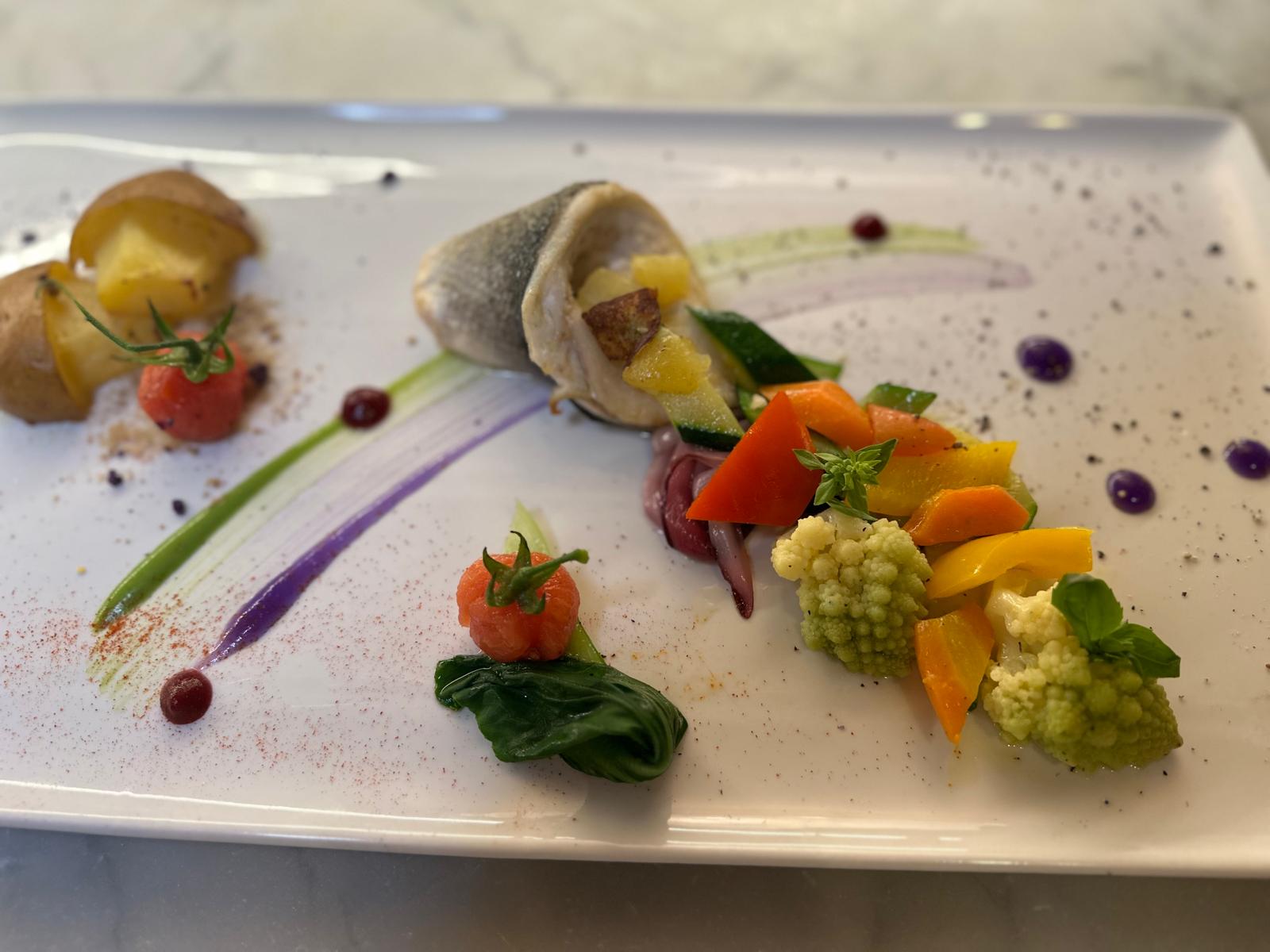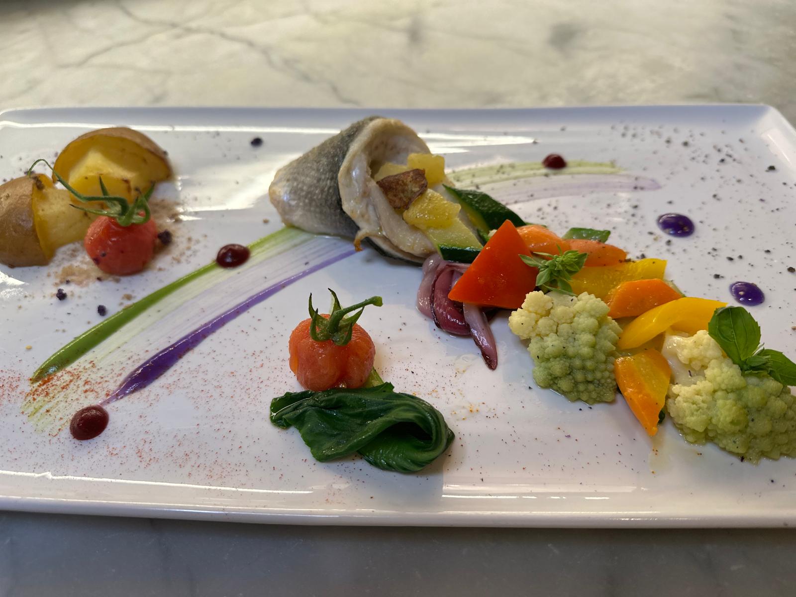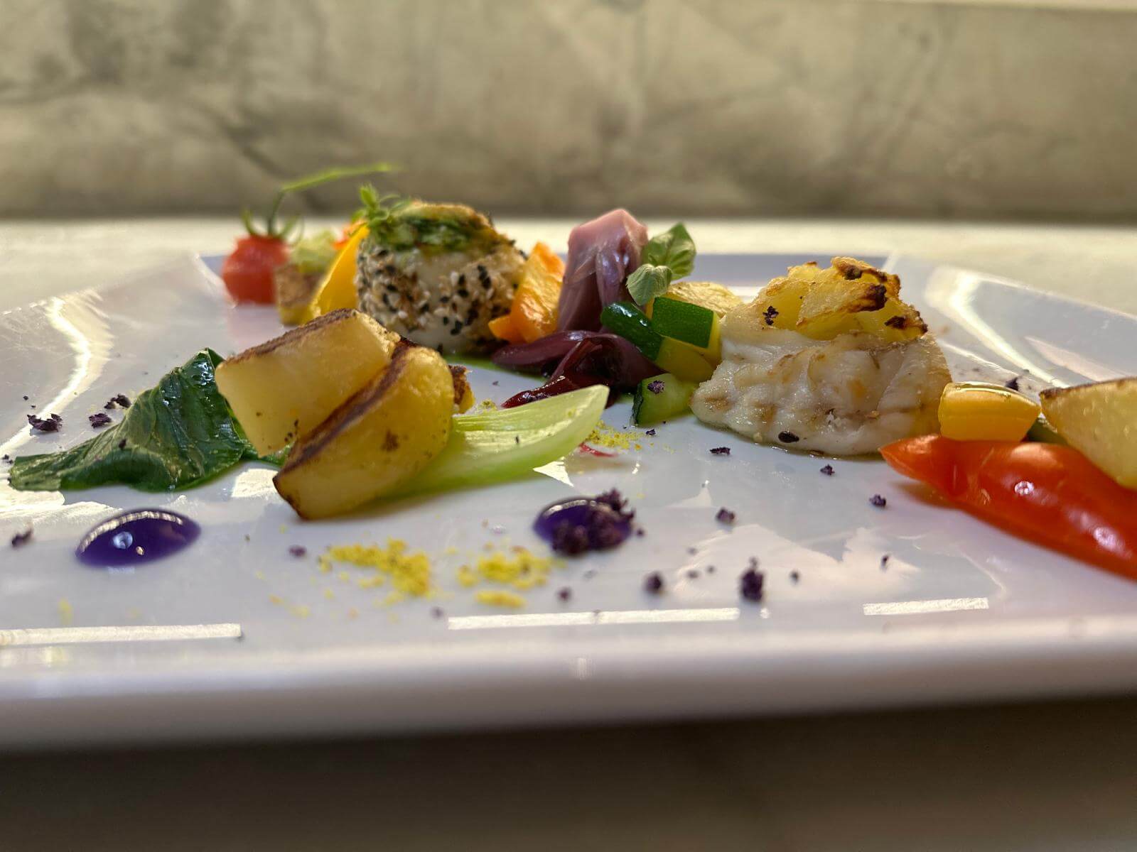 Trancio di Ombrina Ocellata scottata accompagnata da Mazzancolle di Fano