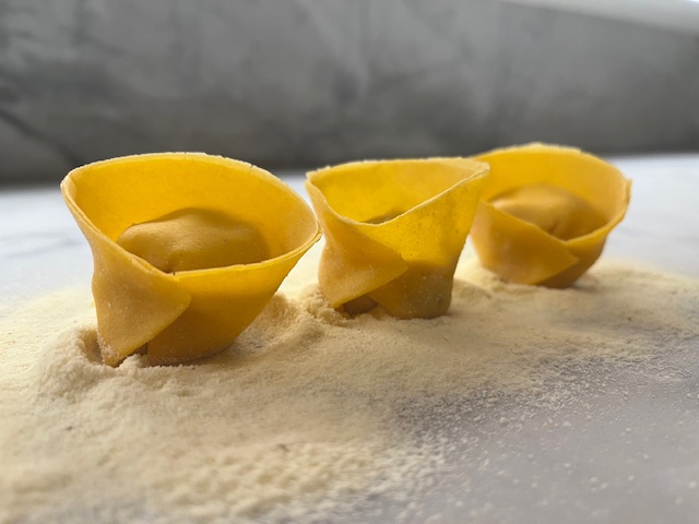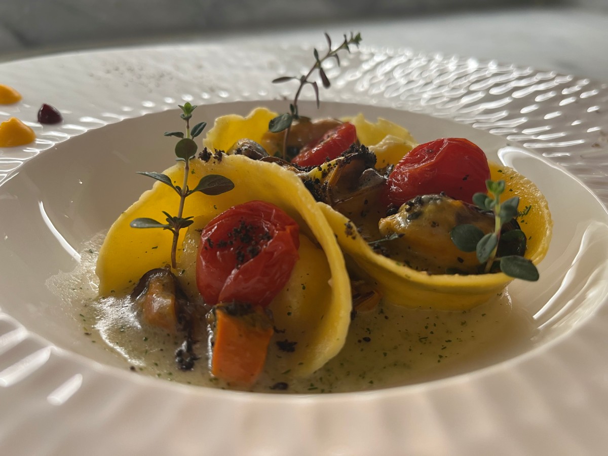 Ravioli Casarecci ripieni con Bufala e Ricotta su Vellutata di Pevarasse